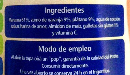 Hace unos días compré un potito de frutas para mi niña. En el tarro anunciaba que tenía manzana, naranja, plátano y galletas. Sin duda, una merienda muy apetitosa para mi niña. Antes de dárselo lo probé, como hago con casi todo, y me supo principalmente a manzana. Entonces eché un ojo a la composición y me encontré con esto: manzana (61%), zumo de naranja (9%), plátano (9%) y galleta (1%), además de otros componentes como agua, azúcar, etc.