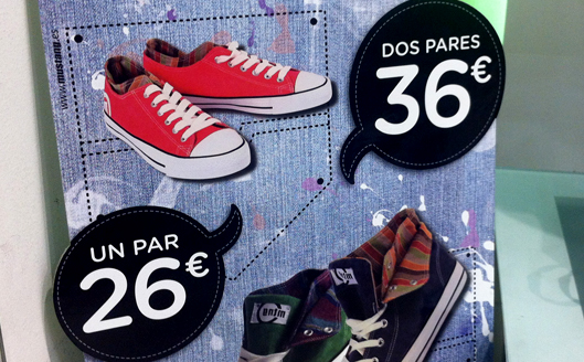 En la segunda tienda he visto otro modelo con algún detalle extra en la zona del tobillo. Son muy similares a las anteriores, pero caramba!, valen 26€ (¡un 138% más!). Me sale caro el adorno del tobillo!. En cualquier caso, es «una cantidad que me puedo permitir«. Además me puedo llevar dos pares con una fantástica oferta: 36€. Curiosamente, el segundo par me vale lo mismo que en la primera tienda. ¿Quizás la oferta no es tanta oferta?