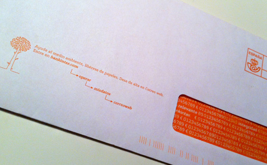 Hace unos días veía la iniciativa de la foto por parte de un gran banco para reducir el envío de cartas a sus clientes. No sólo te recuerdan que puedes usar documentos electrónicos, sino que además te indican en sus sobres los pasos a seguir en tu área de clientes para solicitarlo. Sin duda se trata de un recurso muy simple que se le ocurriría a algún diseñador inspirado. Una forma barata y sencilla de seguir reduciendo la cantidad de papel que dilapidamos cada día.