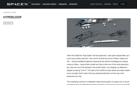 Hyperloop es otro de los impresionantes proyectos de Musk. Una especie de tren supersónico metido en un tubo capaz de alcanzar velocidades superiores a los 1000km/h. Los primeros esfuerzos comunicativos de Musk se centraron en explicar la tecnología subyacente en este revolucionario medio de transporte y enseguida llegó el contramarketing del lobby del transporte tradicional, acentuando la duda de si dicho sistema sería realizable en el corto/medio plazo.